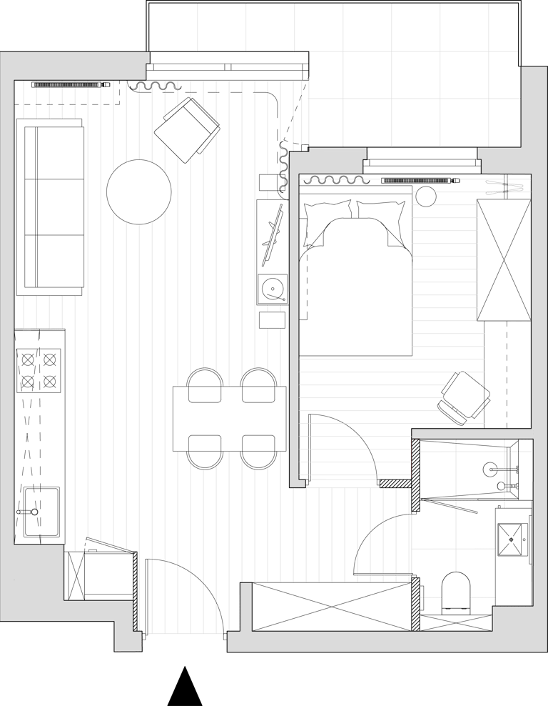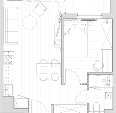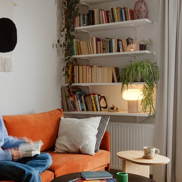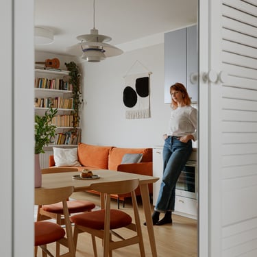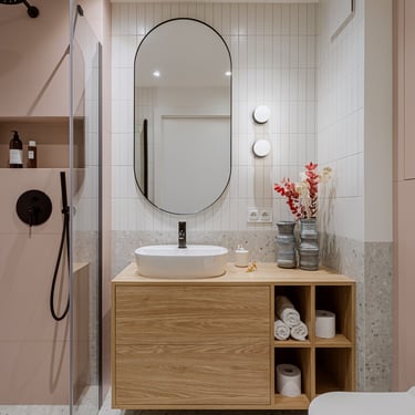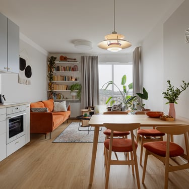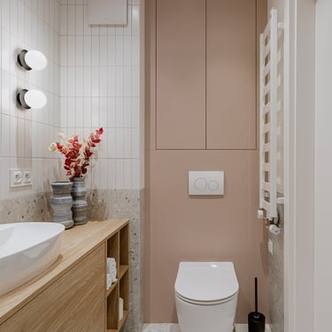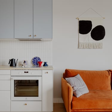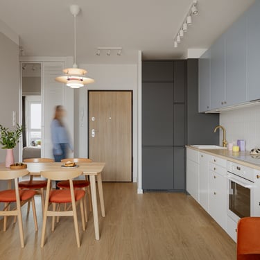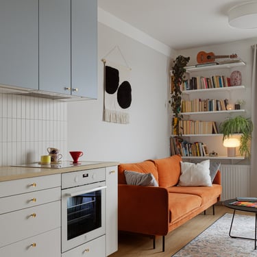 Na tym niewielkim metrażu udało nam się zmieścić 3-kolorową kuchnię, dużą sofę w kolorze soczystej rudości, różową łazienkę, oraz dużo miejsca do przechowywania. To właśnie funkcjonalność wpłynęła na zadowolenie z efektu Inwestorki.