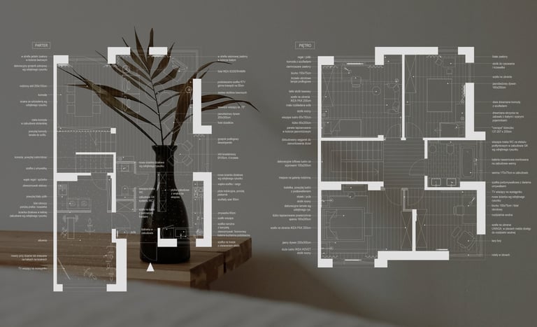 wytyczne dla zabudowy meblowej na miarę ze specyfikacją materiałową, wskazaniem otwieralności szafek oraz propozycją rozplanowania wnętrz poszczególnych zabudów meblowych,